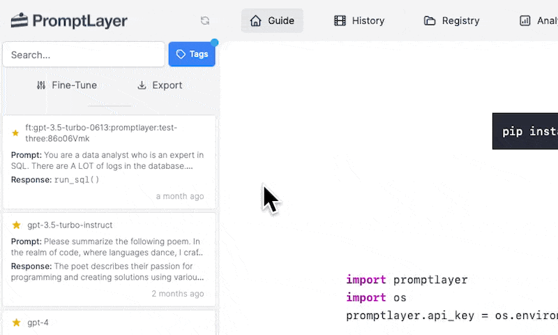 Use the tags search filter to search for specific tags within the PromptLayer. Tags are used to group product features, prod/dev versions, and other categories. You can search for tags by selecting them in the “Tags” dropdown. Tagging a request is easy. Read more about it here.Favorites